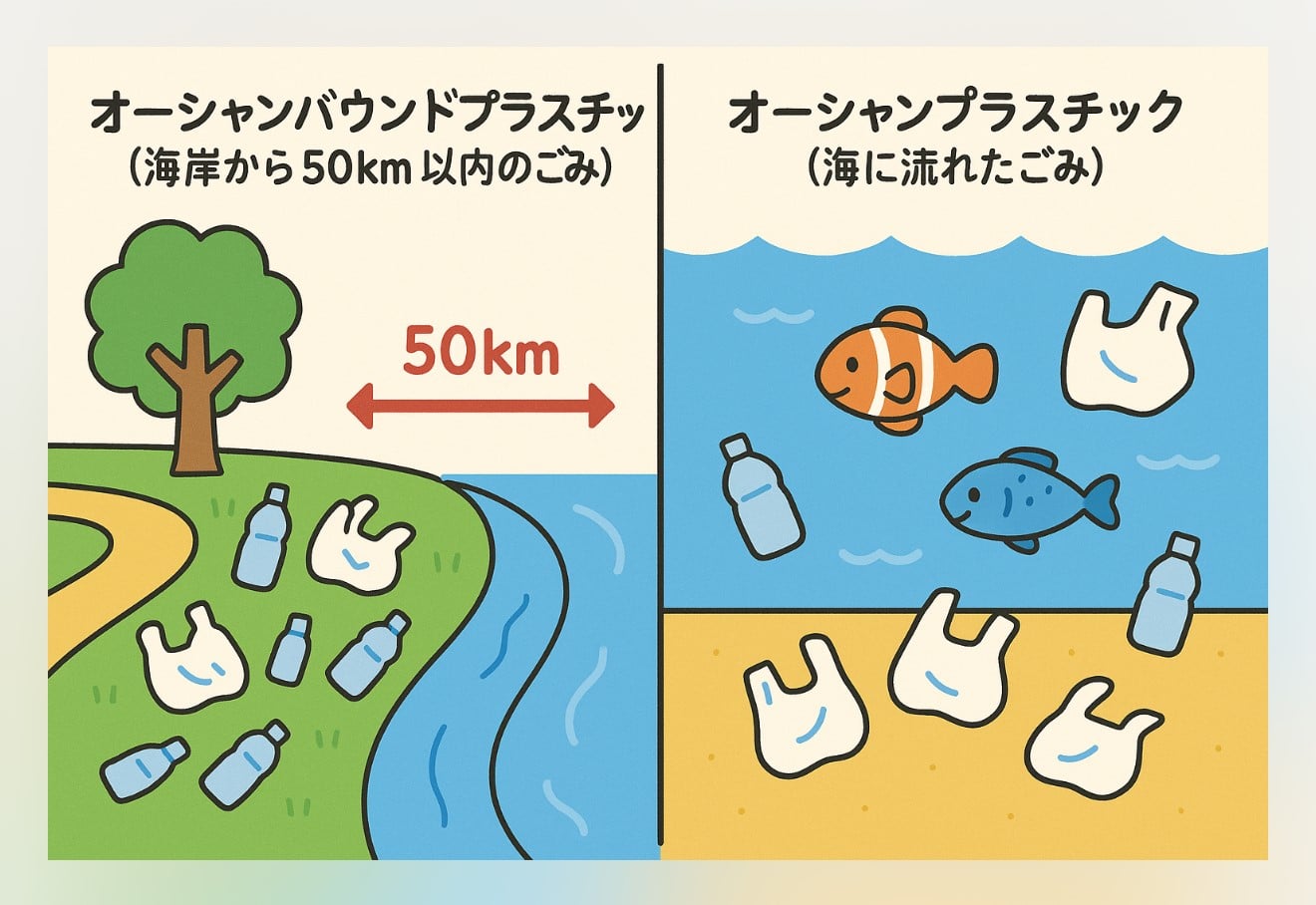 - オーシャンバウンドプラスチック(OBP) 海岸から約50km以内の内陸に捨てられた、まだ海に流れ込んでいないけれど、このままだと海に流れてしまう可能性が高いプラスチックごみ。